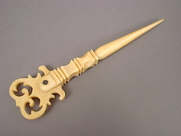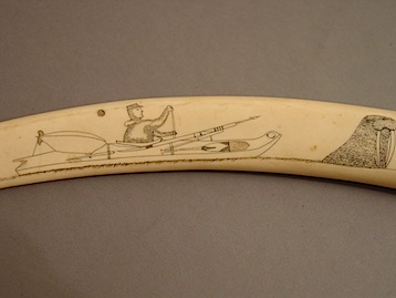 This early 20th-century cribbage board exhibits fine quality engraving of an Eskimo in his umiak pursuing a large walrus. The tusk is 11 inches in length.