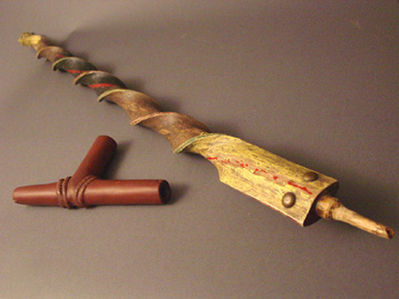 Important chieftain’s peace pipe with carved, twisted wooden snake design and brass tack eyes. Retains much of original paint decoration. Nicely carved Catlinite T-bowl, with rope details. Circa 1860s, South Dakota. Bowl measures 8” X 4”; stem measures 36” X 2”.